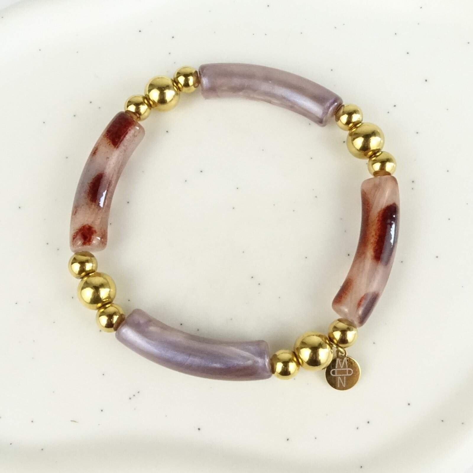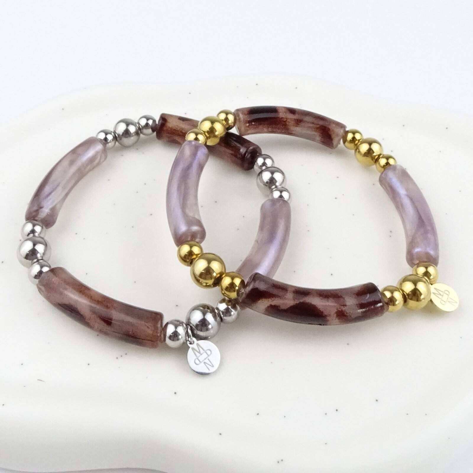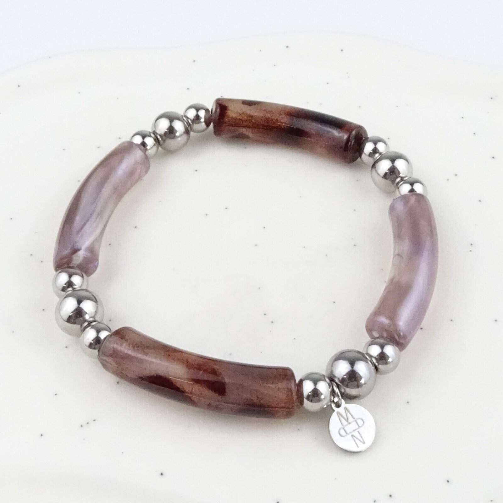 Deze stijlvolle Sweet moon purple/tijger  armband van Maan Jewels is een perfecte combinatie van modern design en duurzaamheid. De armband is gemaakt van hoogwaardig stainless steel en afgewerkt met een elegant acryl item. Dit zorgt voor een eigentijdse en luxe uitstraling. Het sieraad is geschikt voor dagelijks gebruik en past bij elke outfit.