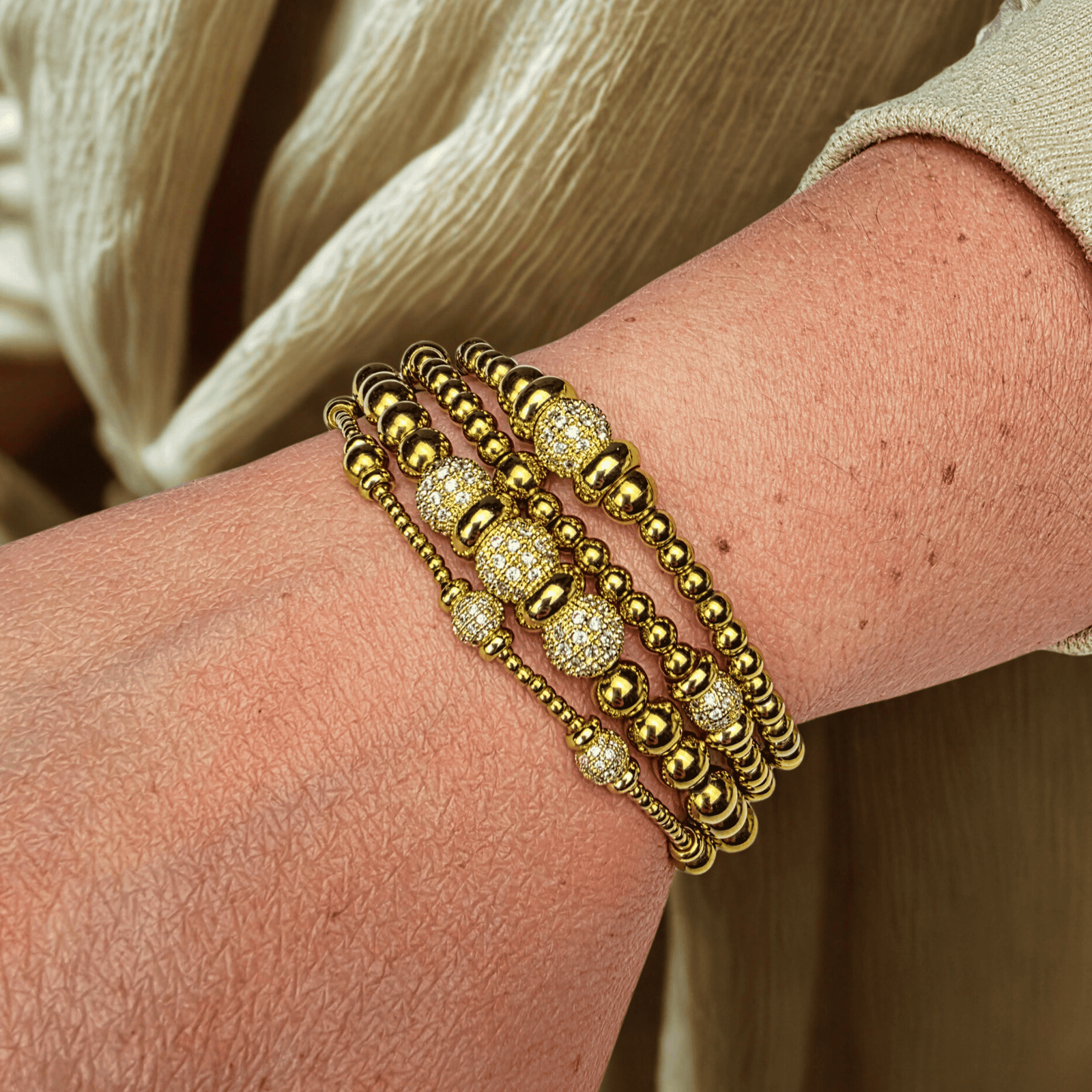 Wat deze armband echt bijzonder maakt, zijn de sprankelende zirkonia ballen die tussen de kralen zijn verwerkt. Deze kleine, schitterende elementen vangen het licht op een prachtige manier en geven de armband een luxe uitstraling. Het resultaat is een subtiel fonkelend effect dat perfect past bij zowel een casual outfit als een elegante avondlook.